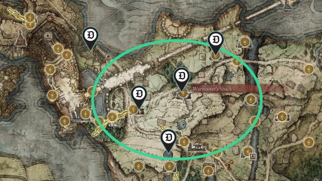 - Warmaster’s Shack (Central Stormhill): A small shack in the woods. A Merchant, Knight Bernahl, sells Ashes of War. At night, a Bell Bearing Hunter prowls the Shack.