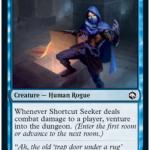 Shortcut Seeker is a Common that uses Venture, providing entrance into a dungeon or the ability to advance to the next room. The Venture mechanic can be found on higher rarity cards, too. Ellywick Tumblestrum is a new MTG planeswalker whose plus-one is Venture, while Nadaar, Selfless Paladin is a Legendary Dragon Knight creature with the new AFR mechanic.