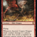 Each ancient metallic dragon allows players to roll a d20 whenever the creature deals combat damage to a player. A d20 is a specific type of 20-sided die used for playing D&D, and is typically the core die used for players rolling attacks and ability checks. This is not to be confused with 20-sided spindown dice, which are often used in MTG as tools for tracking life totals.