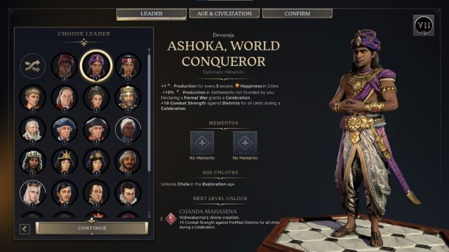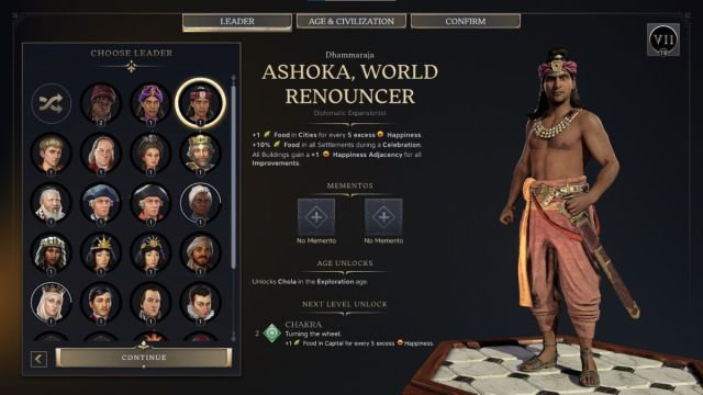 Ashoka has two different personas in Civ 7, and the World Renouncer can be a lot of fun if you enjoy experimenting with the diplomacy feature. The main category here is Diplomatic Expansionist, and the perks on offer are: