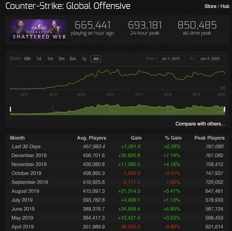 In December CS:GO’s player count grew exponentially over the course of the month, culminating with a peak of 767,060 players, which is the highest amount of concurrent players since January 2017, which hit a peak of 814,616 players.