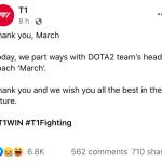 The International 2022 will be returning this weekend, and teams who failed to qualify for the event have already started shuffling their rosters. Though the first set of departures came from the Eastern European Region, T1 officially released coach March from its roster, while Kuku and Xepher announced they were looking for new opportunities.