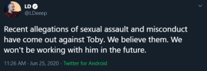 “The person who could not take ‘No’ for an answer and initiated sexual activity with me against my clear and repeated wishes is Toby ‘TobiWan’ Dawson,” Meruna said.