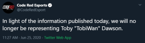 In response, Code Red Esports will no longer represent Dawson, Beyond the Summit has cut ties with him, and Valve has removed his voice lines from The International 10 Battle Pass.