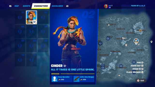 Cinder is found on the right side of the Fortnite island, north of Shining Span and south of Demon’s Dojo. However, the quickest way to find her is to head east from the mountain outside Brutal Boxcars.
