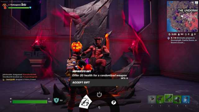 Unlike other NPCs, you can’t shoot or damage Mephisto in Fortnite, which pays homage to his Immortality in the Marvel comics. However, as Mephisto grows stronger in his alternative dimension called Hell, he accepts sacrifices from his followers where you can offer him a part of your health to gain certain services.