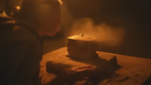 Another snippet later in the video shows the supposed protagonist dusting off the treasure. The hair and clothing look the same as earlier in the video, with something that looks like a scarf wrapped around her neck (which the reporter also had).