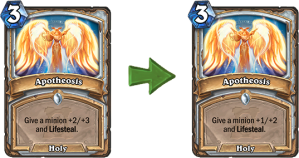 Despite Priest not appearing in the top-five represented decks in the recent competitive standard ladder meta, the class has drawn ire from the community due to the amount of healing and random card generation it could find in a pinch. Apotheosis’ stat nerf makes the card less efficient and game-swinging when used on minions like Blademaster Samuro.