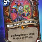 Blizzard revealed Ringmaster Whatley and Ringmaster’s Baton today. Ringmaster Whatley is a five-mana Legendary Warrior minion with 3/5 combat stats and a value-based Battlecry. When you play Ringmaster Whatley from your hand, he draws a Dragon, Mech, and Pirate from your deck. Ringmaster’s Baton is a two-mana 1/3 weapon that buffs every Dragon, Mech, and Pirate in your hand with +1/+1 bonus stats.