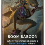 Boom Baboon is a Common two-mana 3/1 unit from Piltover and Zaun with an ability that creates a Flame Chompers in your hand when its summoned.