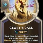 Mono-Shurima Legends of Runeterra decks now have easier access to the Emperor’s Deck via the Forces from Beyond spoiler, Glory’s Call. The Emperor’s Deck is a list of nine cards that are created when Azir hits level three. Synergizing with Ascended champions, Glory’s Call costs two less to cast from six mana for each Ascended ally during this game. It then will Manifest a card from the Emperor’s deck that costs nine or less, excluding only Ascended’s Call from the possibilities.
