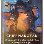 Chief Nakotak supports these hot transformers. The three-drop Yordle has 3/3 base stats but is not a multi-region LoR card. Chief Nakotak fully heals an ally upon transformation, making Giga Gromp and TerrorDactyl valid threats, and grants the transformed ally +1/+1.