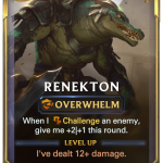 Renekton is a four-mana Ascended champion unit with 4/4 combat stats and the Overwhelm keyword. He also has an ability that gives him a temporary +2/+1 buff for the round if he challenges an enemy. Renekton reaches level two after he’s dealt 12 damage.