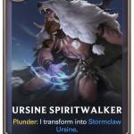 Ursine Spiritwalker is a five-drop with 4/6 stats that transforms into Stromclaw Ursine, a 6/6 with Overwhelm. The token also has an ability that provides all other 5+ power allies Overwhelm. Its stats are impressive, but whether it can pull off Plunder within the new meta will determine how good it is.