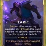 Taric is a four-cost champion unit with 2/4 in stats with a Support ability that grants him and his supported ally Tough this round. He also casts a copy of the last spell cast on him onto the supported ally as well. Taric reaches his leveled form when he sees you support or target allies with spells seven times.