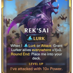 Luckily for users of Rek’Sai, having her reach 10 power when she declares an attack isn’t the most arduous task and can sometimes be achieved as soon as turn three if you’re fortunate enough. A mix of temporary attack buffs and triggering enough Lurks means your opponent will have to count and plan against Rek’Sai’s arrival accordingly.