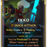While Ekko provides nothing for you defensively, his aggressive statline and keyword allow you to turn up the heat on your opponent and convert your extra spell mana into card draw whenever he strikes. One debilitating downside is that Ekko’s two health leaves him open to most removal options. To circumvent this weakness, try leveling up Ekko before you play him by activating multiple Predict cards before his summon.