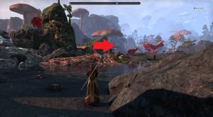 The quickest route to the Telvanni Peninsula CE Treasure Map I treasure is to fast travel to the Ald Isra Wayshrine and then head south along the road. Once you get to the fork in the road, travel directly east. There will be a choke in the river, and nearby you’ll see a giant, flat mushroom cap that’s lower to the ground than the others around it, as indicated in the screenshot below.