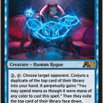 The three Blue A:22 cards provide utility, from stealing your opponent’s cards off the top of their library to bouncing nonland permanents with a creature that has Flash. And Choice of Fortunes puts a new spin on Seek, allowing players to essentially mulligan the first Seek options if they want.