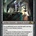 Graven Archfiend is also an interesting, yet expensive creature, who conjures Demonic Pact to the battlefield if a non-demon was sacrificed as an additional cost when casting.