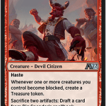 The A:22 cards in the color Red are all about aggressive gameplay, Sacrifice, and burn damage. Pass the Torch has some potential, able to Perpetually give a creature card in hand the ability to deal two damage to any target upon dealing combat damage via Pass the Torch. And Big Spender pops out Treasure tokens whenever a creature you control is blocked while also having a Spellbook that is accessed via sacrificing two Artifacts.