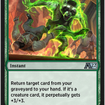 Each of the three Green A:22 cards has a unique spin on existing MTG mechanics. Loose in the park draws a card upon ETB and can transform a basic land into a creature via its Spellbook and ability. Menagerie Curator provides ramp and card draw. And Giant Regrowth returns a card from your graveyard while Perpetually giving it +3/+3 stats.