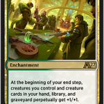 Spara’s Bodyguard is a versatile three-drop that provides Shield Counters to creatures in your hand. And Arming Gala is an expensive Enchantment that Perpetually pumps all creature cards (whether in hand, graveyard, library, or battlefield) +1/+1.