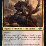 Urak-ahi leaders form armies to overrun opponents within the Black and Red LTR Draft archetype. The color pair supports goblins and orcs through the Amass mechanic while having an aggressive go-wide gameplay strategy.