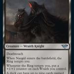 Having nine different art variants within the LTR set is Nazgul. The Uncommon allows players to put up to nine copies of the wraith knight into a deck, which is very powerful in a format like Commander, where players can only have one copy of a card unless otherwise specified. The Nazgul are in high demand, with various art variants having different prices.