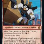 Every MTG Transformer card has More Than Meets the Eye. Each of the 15 cards is double-faced, showcasing a legendary Artifact creature on the front side and a legendary Artifact vehicle on the backside. The More Than Meets the Eye mechanic allows players to cast the backside at an alternative mana cost.