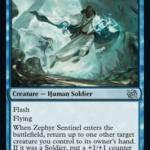 Zephyr Sentinel is a well-designed Uncommon two-drop in Blue. The human soldier has Flash and Flying on a 2/1 body. Zephyr Sentinel also synergizes with the WU soldier archetype, scaling in power by +1/+1 should you choose to return a soldier to hand. Zephyr Sentinel opens lines for cool combos and can protect key cards under the threat of removal.