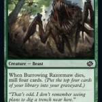 Burrowing Razormaw has an aggressive 4/2 body that encourages you to trade in combat. When it dies, you mill four cards. This is a great Common way to fill up the graveyard while having a battlefield presence. Be comfortable with attacking or blocking aggressively and force the opponent to lose their game pieces. In a Green deck that wants to play out of the graveyard, you’ll come out on top every time when Burrowing Razormaw dies in combat.
