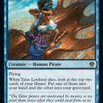Blue has its share of good Commons. Talas Lookout is a four-mana 3/2 Flying Creature that generates value when it dies. When Talas Lookout dies, you look at the top two cards of your library and put one into your hand and one into your graveyard.