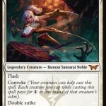 The Wandering Emperorer is rotating out of Standard through 2024 Standard rotation, but the Legendary is on the plane of Duskmourn seeking to find Nashi, the son of Tamiyo. Featuring Flash and Convoke, the Samurai Noble has Double Strike and grants other tapped creatures you control Hexproof on a 3/4 body.