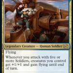 Soldier tribal in the Blue and White BRO Limited Draft is a strong archetype that needs a few essential pieces to have it pop off for consistent wins. Harbin, Vanguard Aviator is one of the pieces. A 3/2 creature with Flying for only two mana (WU) is solid on its own. Harbin, Vanguard Aviator also pumps the team when five or more soldiers attack, which isn’t hard to accomplish in the colors White and Blue. The human soldier counts itself when attacking, and can still work in WU builds where other important soldier-themed cards are missing.