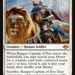 - First ability: When Ranger-Captain of Eos enters the battlefield, you may search your library for a Creature card with converted mana cost one or less reveal it, put it into your hand, then shuffle your library.
