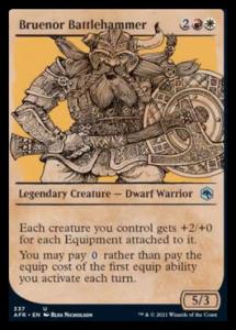Bruenor buffs equipped Creatures and reduces the equip costs. A big part of what makes Equipment strategies difficult to use is the added cost to put them on Creatues. Using mana to pay for an equip cost instead of developing your battlefield can result in a bad tempo loss.
