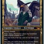 White is the main color within the Brokers family, thematically providing protection and control in conjunction with the MTG colors Green and Blue. Falco Sapra, Pactweaver is a bird demon that has the SNC mechanic Shield Counter, a Brokers mechanic within the set.
