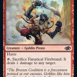 Fanatical Firebrand is a great one-drop in Limited aggressive builds as a 1/1 with Haste that can tap at Instant speed to sacrifice itself to deal one damage to any target. And the burn gets better with Chandra’s Flame Lash, dealing four damage to any target—along with Goblin Grenade dealing five damage to any target.