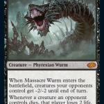 The one possible Mythic Rare in J22 Gross packs is Massacre Wurm from Mirrodin Besieged. It’s a Wurm that drains opponents for life upon their creatures dying while hitting all of your opponent’s creatures with -2/-2 upon entering the battlefield.
