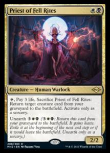 There is also a running theme that Priest of Fell Rites continues with adding life to the cost of abilities. Three life isn’t much for a reanimation effect. Unearth allows this card to find repeatable value.