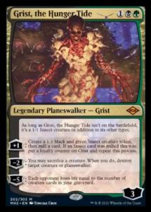 Once Grist is on the battlefield its loyalty abilities contribute to a token-based aristocrats strategy. Grist wants to be used in Insect tribal, but can find use in other decks. The -2 ability is a solid source of removal. The ultimate ability is a game-ender if you can dump creatures in your graveyard.