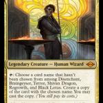 - First ability: Tap: Choose a card name that hasn’t been chosen from among Disenchant, Braingeyser, Terror, Shivan Dragon, Regrowth, and Black Lotus. Create a copy of the card with the chosen name. You may cast the copy.