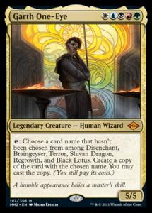 Garth One-Eye is representative of the experimental designs Wizards brings to Modern Horizons 2. In an article by Senior Game Designer Ethan Fleischer, the original templating for Garth allowed the player to look at the top card of their library and put a land or nonland permanent that was printed in Alpha or Beta onto the battlefield.