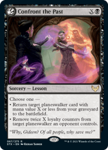 Confront the Past is a decent piece of Planeswalker recursion and removal. It’s a good, situational card that fits into sideboards as a one-of spell. Since Lesson spells can be grabbed from the sideboard, this makes Confront the Past playable with a low deck-building cost.