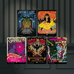 Drawing inspiration from do-it-yourself psychedelic band posters, this drop is a dramatic departure from the standard Magic style reminiscent of the Party Hard, Shred Harder drop from earlier this year. Gamble, Nature’s Lore, Preordain, Decree of Pain, and Wrath of God are getting wild new art from a group of artists that have experience creating rock n’ roll posters.