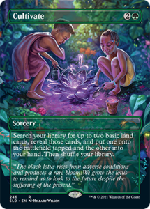Teferi, Hero of Dominaria, illustrated by KNIIO, shows Teferi with his family in a moment that celebrates Black fatherhood. Kaya is Magic’s first Black female planeswalker and her card, Kaya, Ghost Assassin, is getting the alternate art treatment by artist Dani Pendergast. Hillary Wilson takes Cultivate, the efficient mana-ramp spell with flavor text on the persistence of Black people and building a healthier future. It also touches on the history of Black farmers as described in the Secret Lair’s design article.