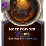 Powder Kegs in LoR are unique in that they can stack upon one another. And More Powder summons two of them. Both More Powder and Powder Kegs have a weakness, though. The spell is at Slow speed and Powder Kegs have the keyword Vulnerable. But if you’re able to stack several of them during a turn, the explosion is worth the effort.