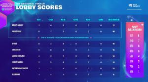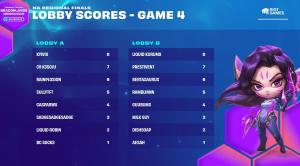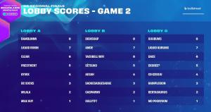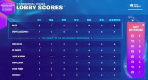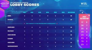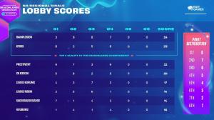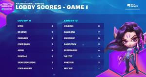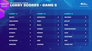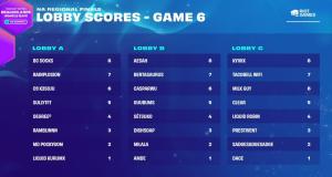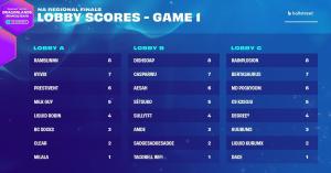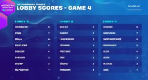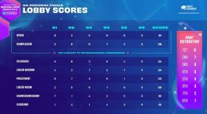 Halfway through day one at the NA Regional Finals, Dishsoap was sitting atop the leaderboard with two lobby wins. Close behind Dishsoap were Ramblinnn, Rainplosion, and Robin. Both Ramblinnn and Rainplosion also had two lobby wins heading into game four.