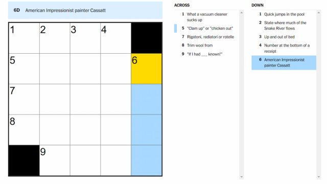 Here are some hints and the official answer for the “American Impressionist painter Cassatt” clue on the Nov. 15 NYT Mini Crossword.